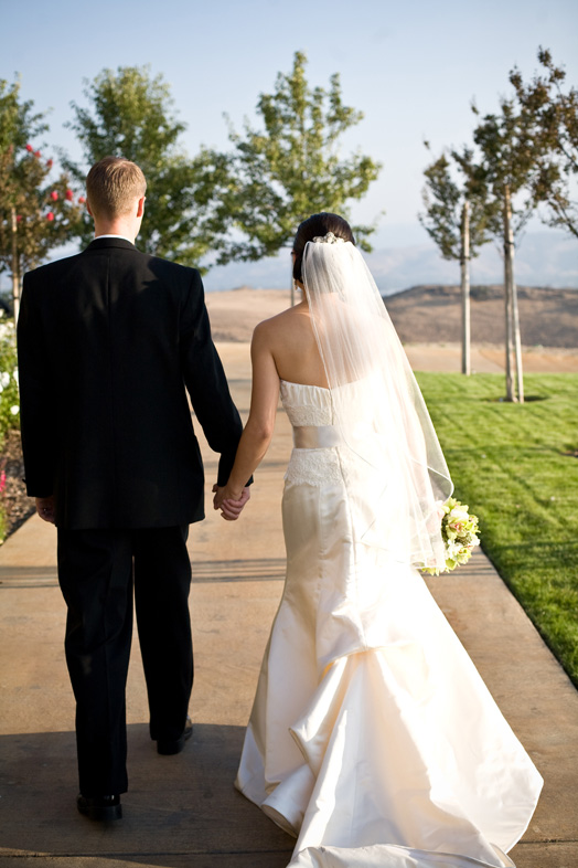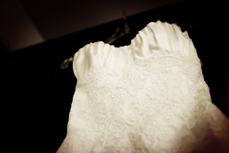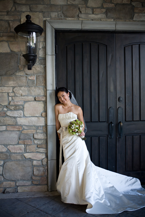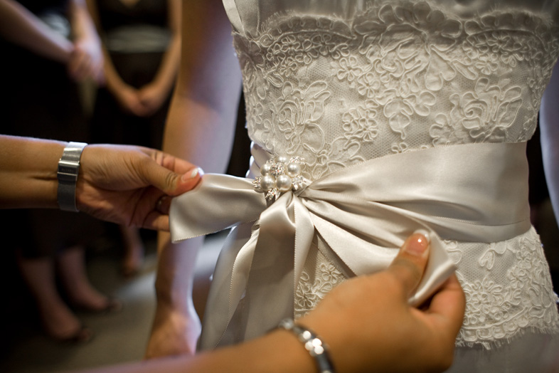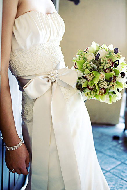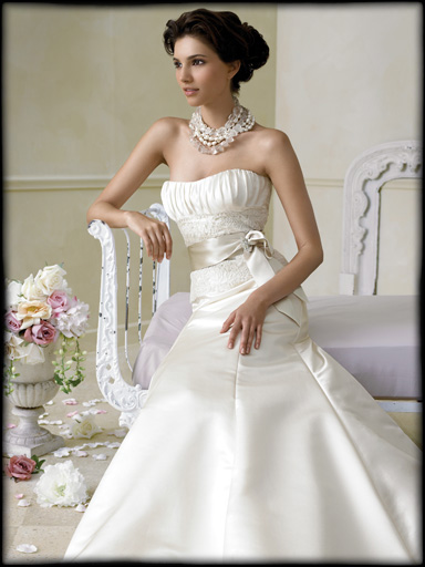 Description: Ivory silk princess satin trumpet gown, strapless shirred empire bodice with alencon lace midriff with ivory satin ribbon, chapel train, french bustle